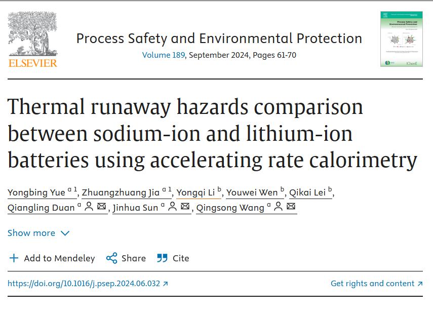 中國科學技術(shù)大學王青松教授團隊在Process Safety and Environmental Protection(IF:6.9)發(fā)表題為Thermal runaway hazards comparison between sodium-ion and lithium-ion batteries using accelerating rate calorimetry論文,該成果由中國科學技術(shù)大學火災(zāi)科學國家重點實驗室和中國南方電網(wǎng)發(fā)電有限公司儲能研究所等機構(gòu)聯(lián)合支持。