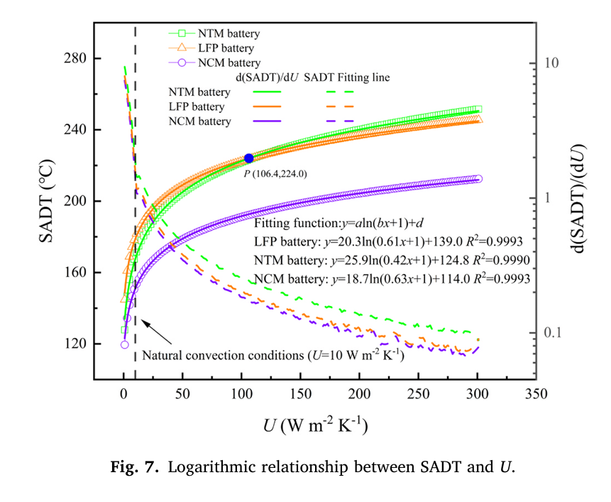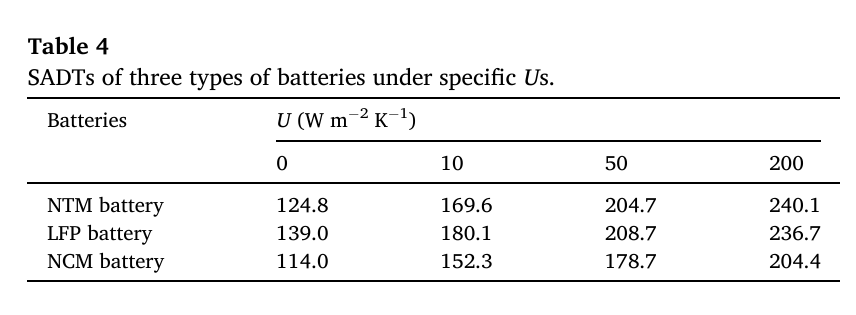 3. 在自然對流條件下,當儲存溫度超過169.6 ℃時,完全充電的NTM電池會自燃。在電池儲存和運輸過程中增加系統(tǒng)表面?zhèn)鳠嵯禂?shù)U已被證明可以顯著提高NTM電池相對于LFP和NCM電池的安全性。