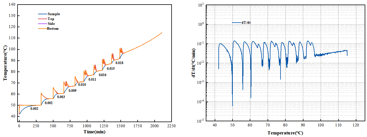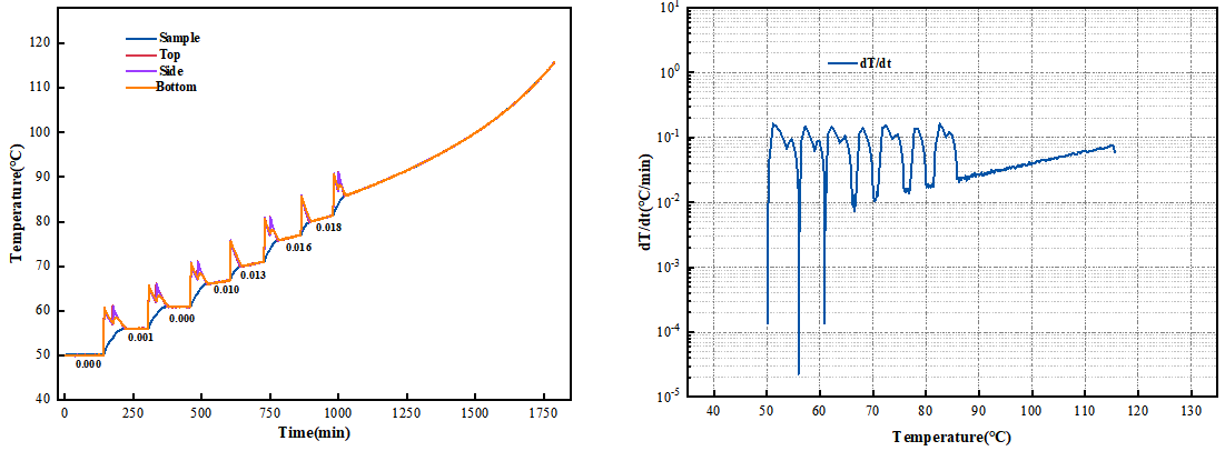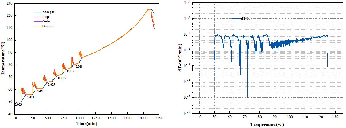 圖9 使用帶保溫棉夾層金屬板夾具的標準電阻塊HWS溫升(左圖)及溫升速率-溫度(右圖)曲線