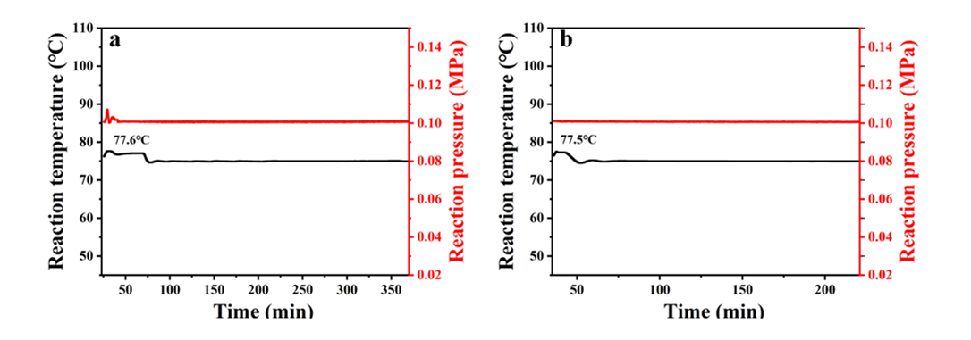 1.使用反應(yīng)量熱法,在兩組反應(yīng)條件下,反應(yīng)過程中均未觀察到明顯的放熱或壓力升高。兩組反應(yīng)的最大反應(yīng)溫度分別為77.6°C和77.5°C,均低于溶劑的沸點(diǎn)。