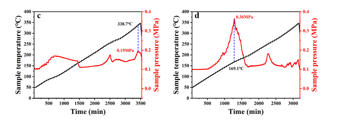 本研究將含有約1.0-1.2 g樣品的不銹鋼彈體嵌入絕熱加速量熱儀TAC-500A設(shè)備中。在50℃~350°C范圍內(nèi)采用經(jīng)典的加熱-等待-搜索(H-W-S)模式,該模式每個目標(biāo)溫度之間的加熱間隔為5°C,每個目標(biāo)溫度保持30分鐘,檢測靈敏度高,能自動檢測并精準(zhǔn)獲取到該反應(yīng)下的溫度和壓力實(shí)時變化數(shù)據(jù),從而計算出該反應(yīng)的關(guān)鍵熱安全參數(shù),為其反應(yīng)危害評估提供可靠的數(shù)據(jù)支持。